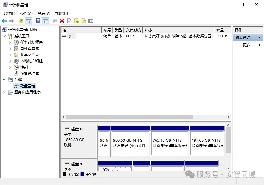 Step2:进入“计算机管理”-“磁盘管理”,观察分区状态。