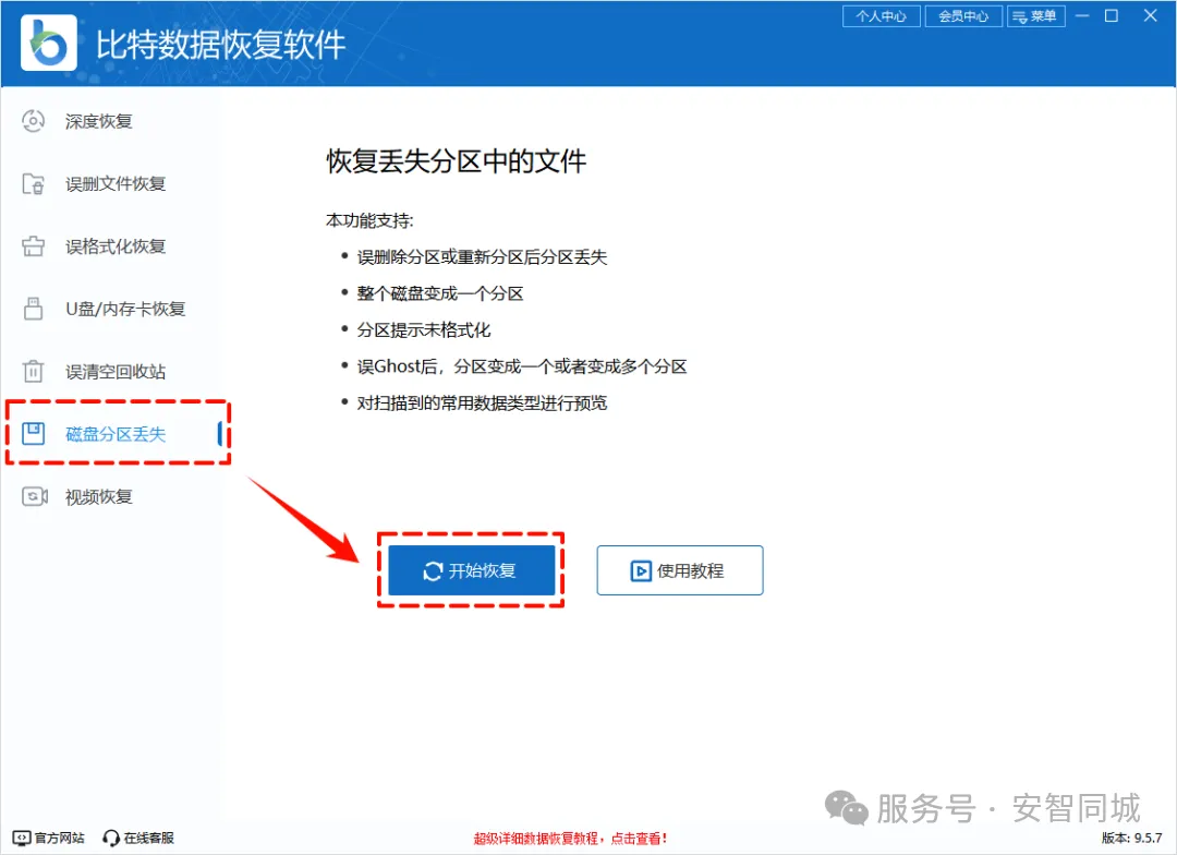 Step2:运行“比特数据恢复软件”,界面选择“磁盘分区丢失”,立马开始扫描。