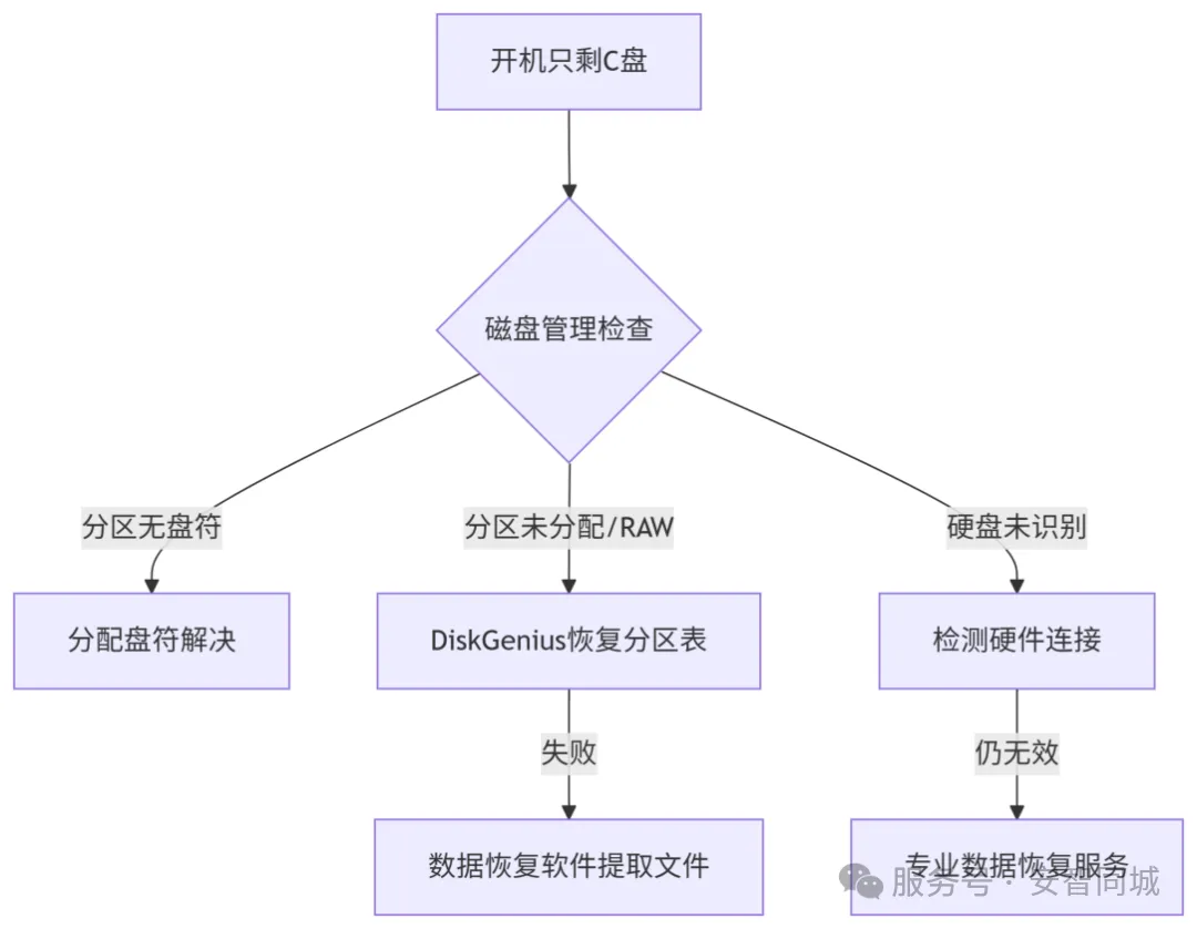 电脑开机后只剩C盘通常是由于分区表损坏、盘符丢失或硬件连接问题导致,并非物理数据丢失。只要及时正确处理,大部分数据可恢复。
