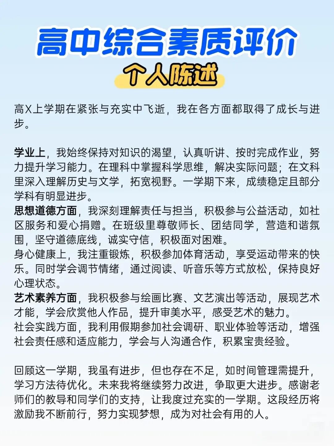 思想道德方面,我深刻理解责任与担当,积极参与公益活动,如社区服务和爱心捐赠。在班级里尊敬师长、团结同学,营造和谐氛围,坚守道德底线,诚实守信,积极面对困难。身心健康上,我注重锻炼,积极参加体育活动,享受运动带来的快乐。同时学会调节情绪,通过阅读、听音乐等方式放松,保持良好心理状态。艺术素养方面,我积极参与绘画比赛、文艺演出等活动,展现艺术才能,学会欣赏他人作品,提升审美水平,感受艺术的魅力。社会实践方面,我利用假期参加社会调研、职业体验等活动,增强社会责任感和适应能力,学会与人沟通合作,积累宝贵经验