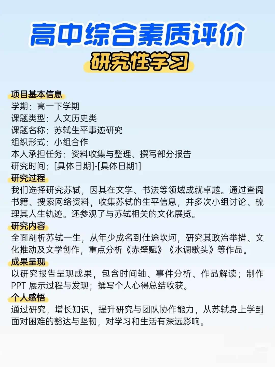 通过研究,增长知识,提升研究与团队协作能力,从苏轼身上学到面对困难的豁达与坚韧,对学习和生活有深远影响。