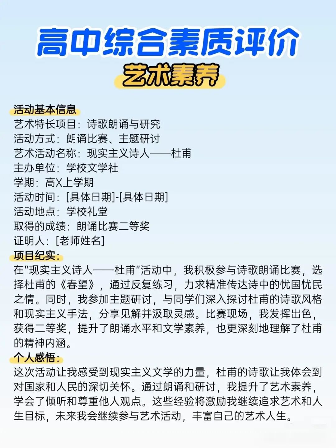 艺术特长项目:诗歌朗诵与研究活动方式:朗诵比赛、主题研讨艺术活动名称:现实主义诗人--杜甫活动时间:[具体日期]-[具体日期]