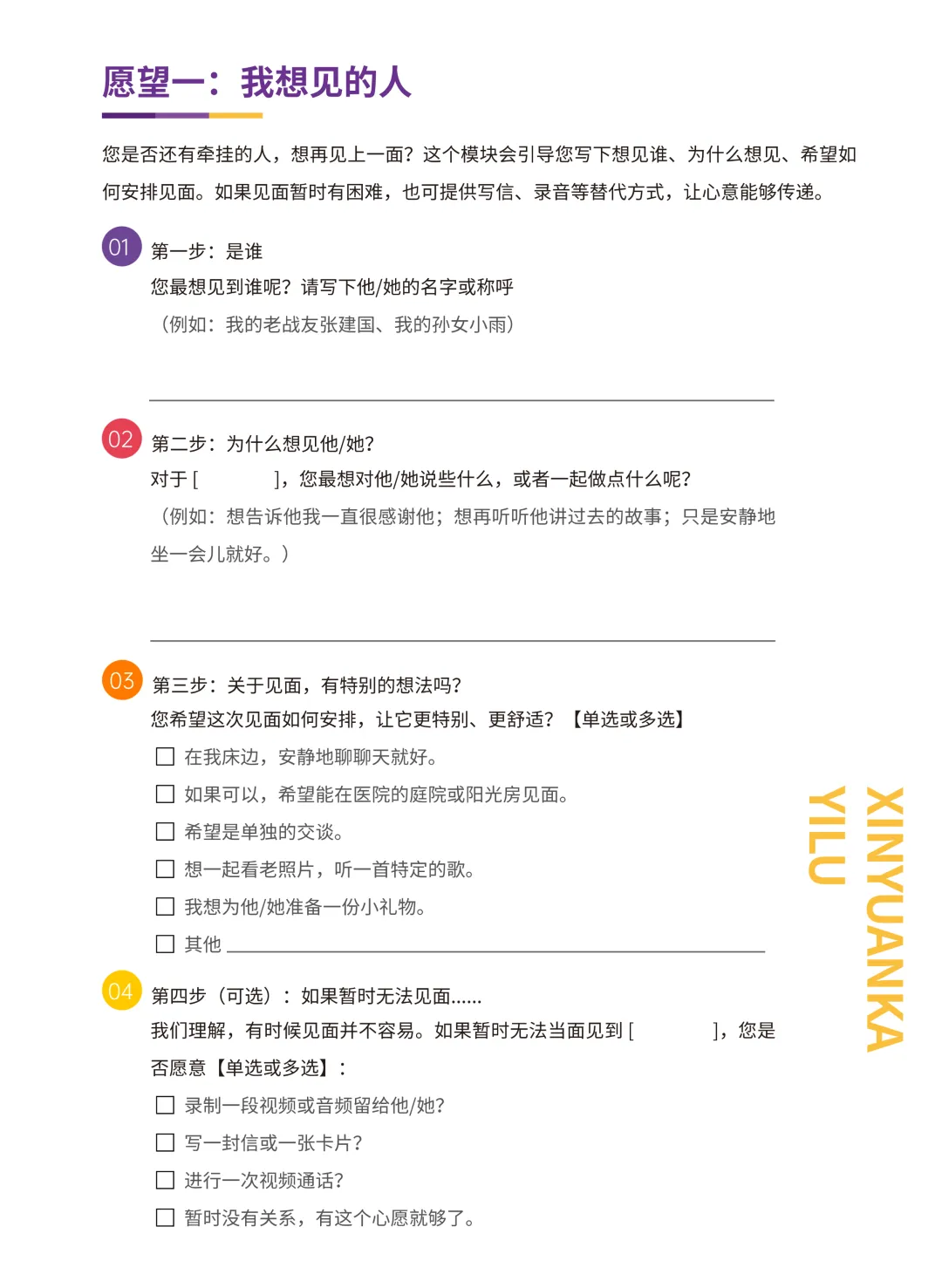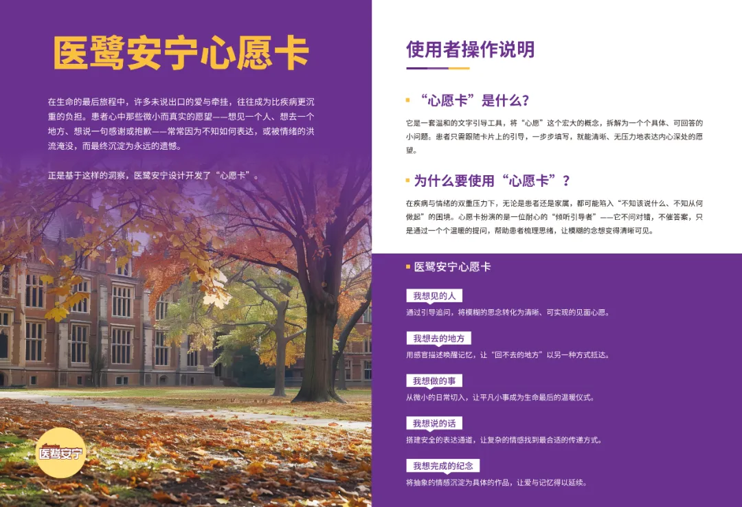 它是一套温和的文字引导工具,将“心愿”这个宏大的概念,拆解为一个个具体、可回答的小问题。患者只需跟随卡片上的引导,一步步填写,就能清晰、无压力地表达内心深处的愿望。