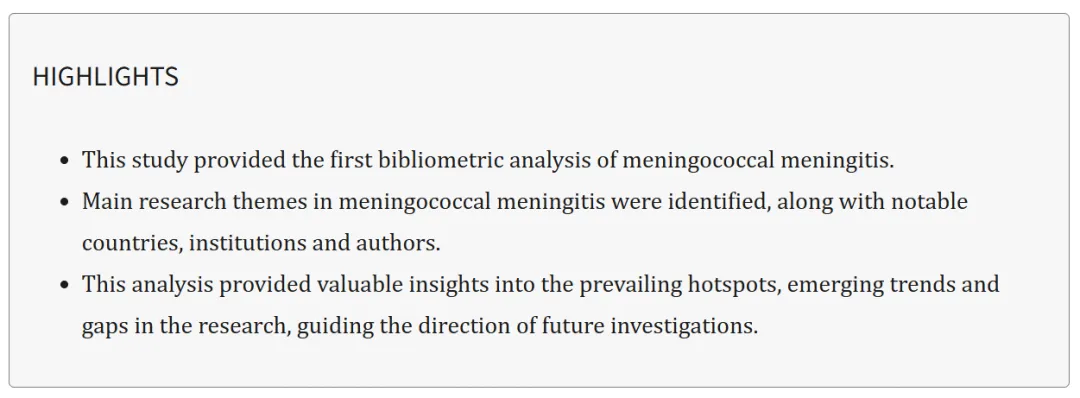 近年来,新发传染病(如COVID-19和猴痘)对全球医疗卫生系统产生了严重影响。脑膜炎奈瑟菌(Neisseria meningitidis)引起的脑膜炎奈瑟菌性脑膜炎,尽管早在一个多世纪前就已被发现,但至今仍然是全球重要的公共卫生威胁。该疾病进展迅速,具有较高的发病率和死亡率。约10%的病例会导致死亡,尤其是在儿童和青少年人群中。此外,大约20%的幸存者会遗留长期后遗症。尽管疫苗技术近年来取得了进展,但由于血清群动态变化、抗菌药物耐药性以及流行潜力等问题,仍然面临诸多挑战。因此,深入了解其流行病学特征、临床表现及研究趋势,对于制定公共卫生策略和疫苗接种计划至关重要。