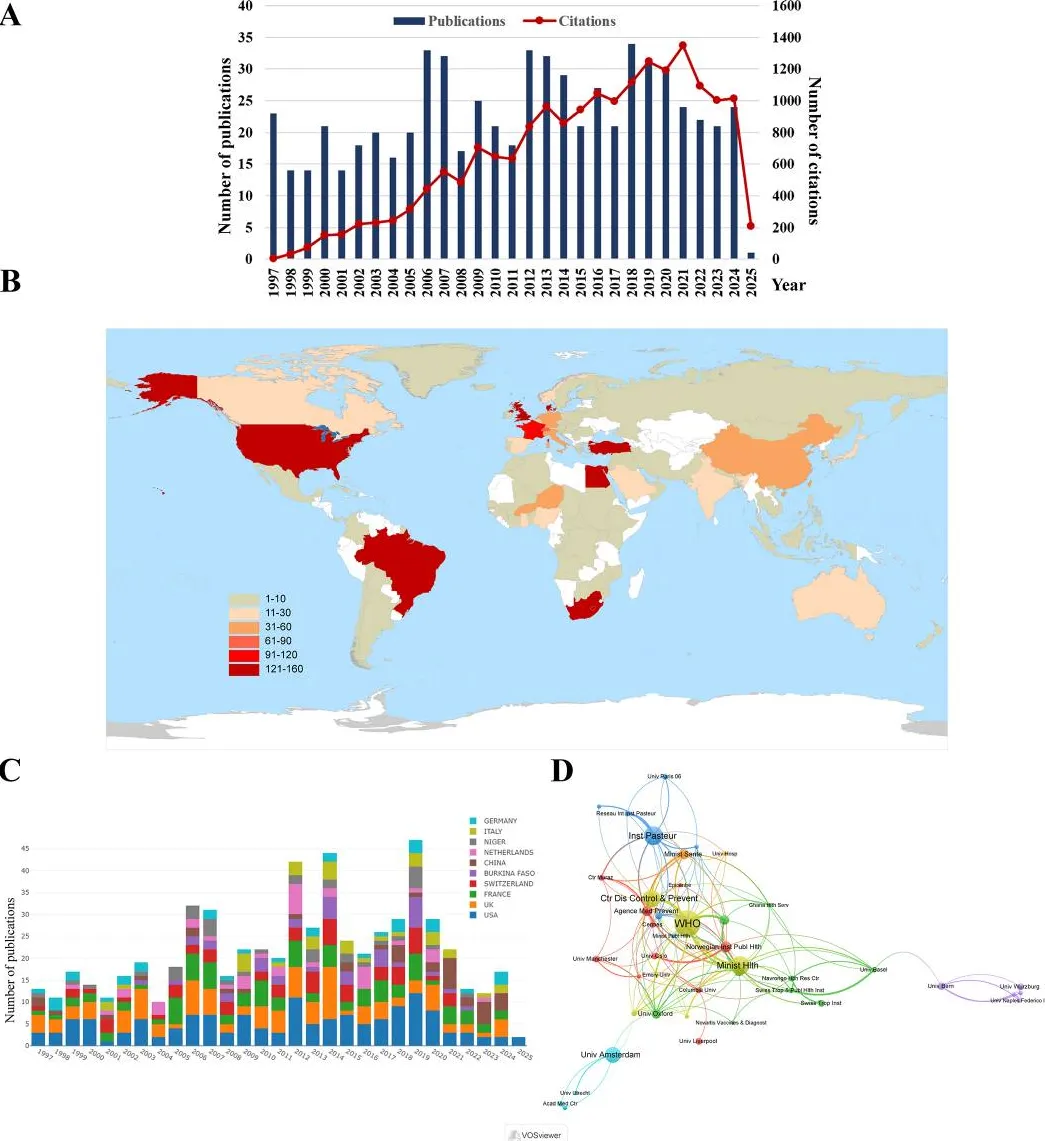 脑膜炎奈瑟菌性脑膜炎的研究趋势如图1A所示。自20世纪90年代末以来,相关文献发表数量逐渐增加,并在2000年前后出现明显增长。此后虽有一定波动,但总体呈上升趋势,并在2010年代初达到峰值。在COVID-19大流行期间,相关文献数量明显下降,提示疫情期间公共卫生重点发生了转移。同时,疫情还导致超过5000万非洲儿童的脑膜炎疫苗接种延迟,从而增加了A群脑膜炎暴发的风险[10]。