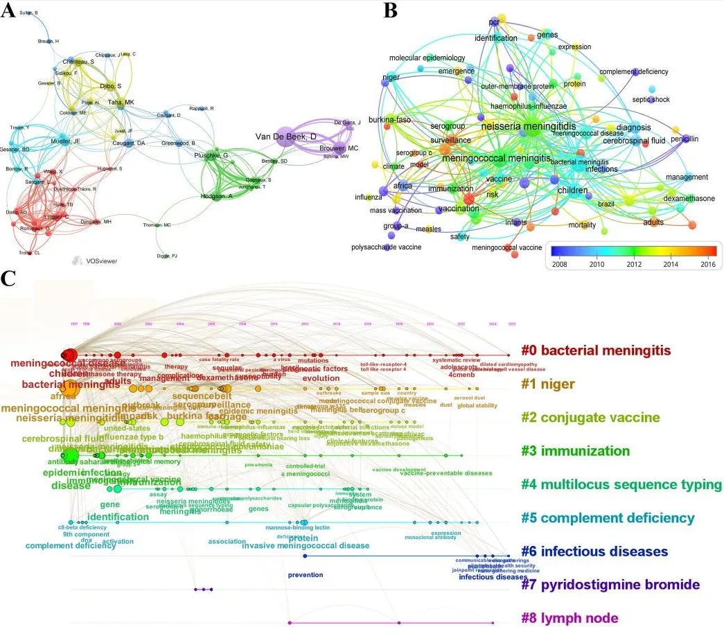为追踪研究热点的演变,对关键词共现的时间线进行了分析(图2C)。可视化结果显示,细菌性脑膜炎(#0)、尼日尔(#1)、结合疫苗(#2)、免疫接种(#3)、多位点序列分型(#4)、补体缺陷(#5)、传染病(#6)、溴吡斯的明(#7)以及预后(#15)是最为突出的研究主题。