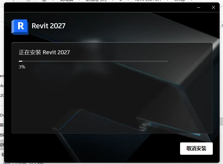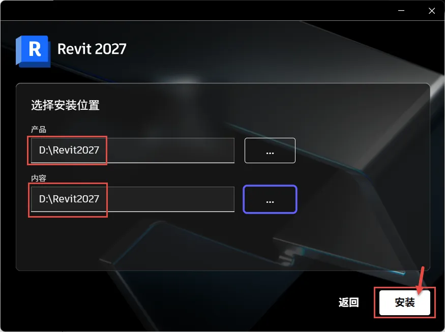 5.先在其他盘内新建一个"Revit2027”空文件夹,然后设置对应安装目录,点击“安装”。