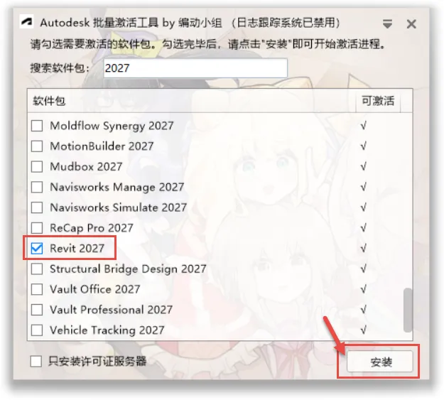 11.勾选“Revit2027”,点击“安装”。