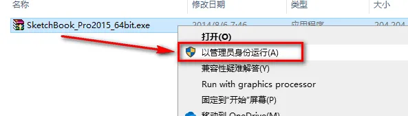 3.选中SketchBook_Pro2015,鼠标右键点击“以管理员身份运行”