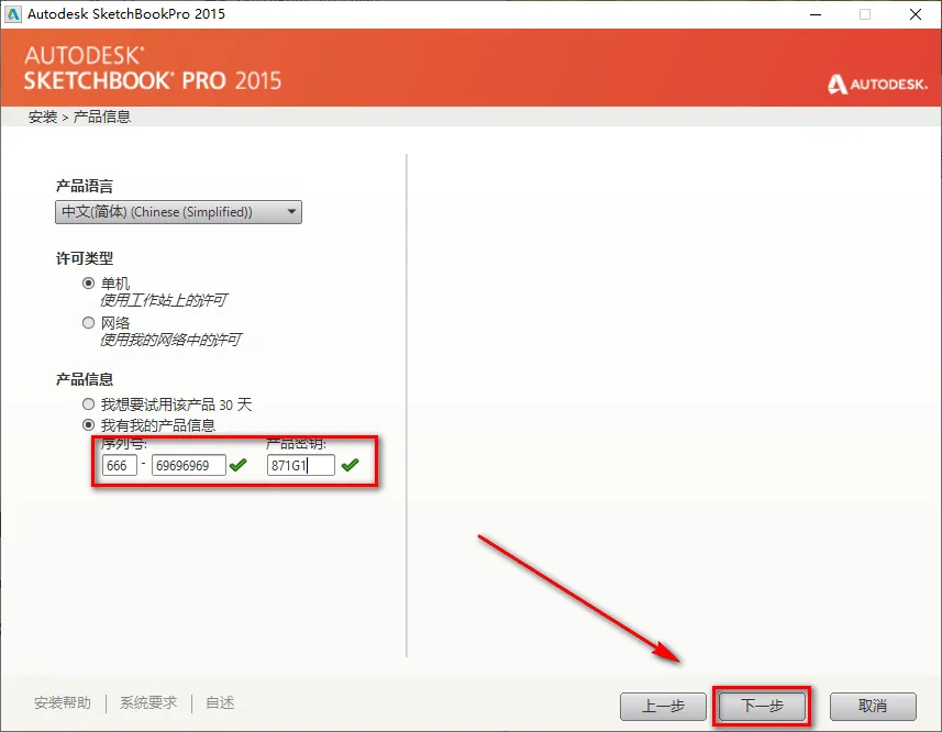 7.序列号输入:666-69696969,产品密钥输入:871G1,点击“下一步”