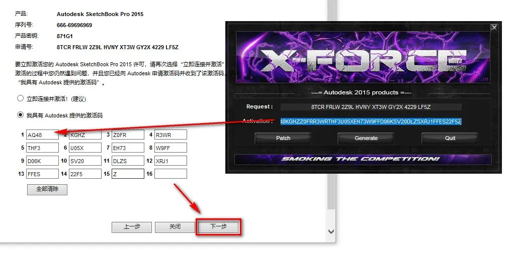 20.将生成的激活码复制到激活码输入框,点击“下一步” 注:复制和粘贴只能用快捷键"Ctrl+C"和”Ctrl+V”