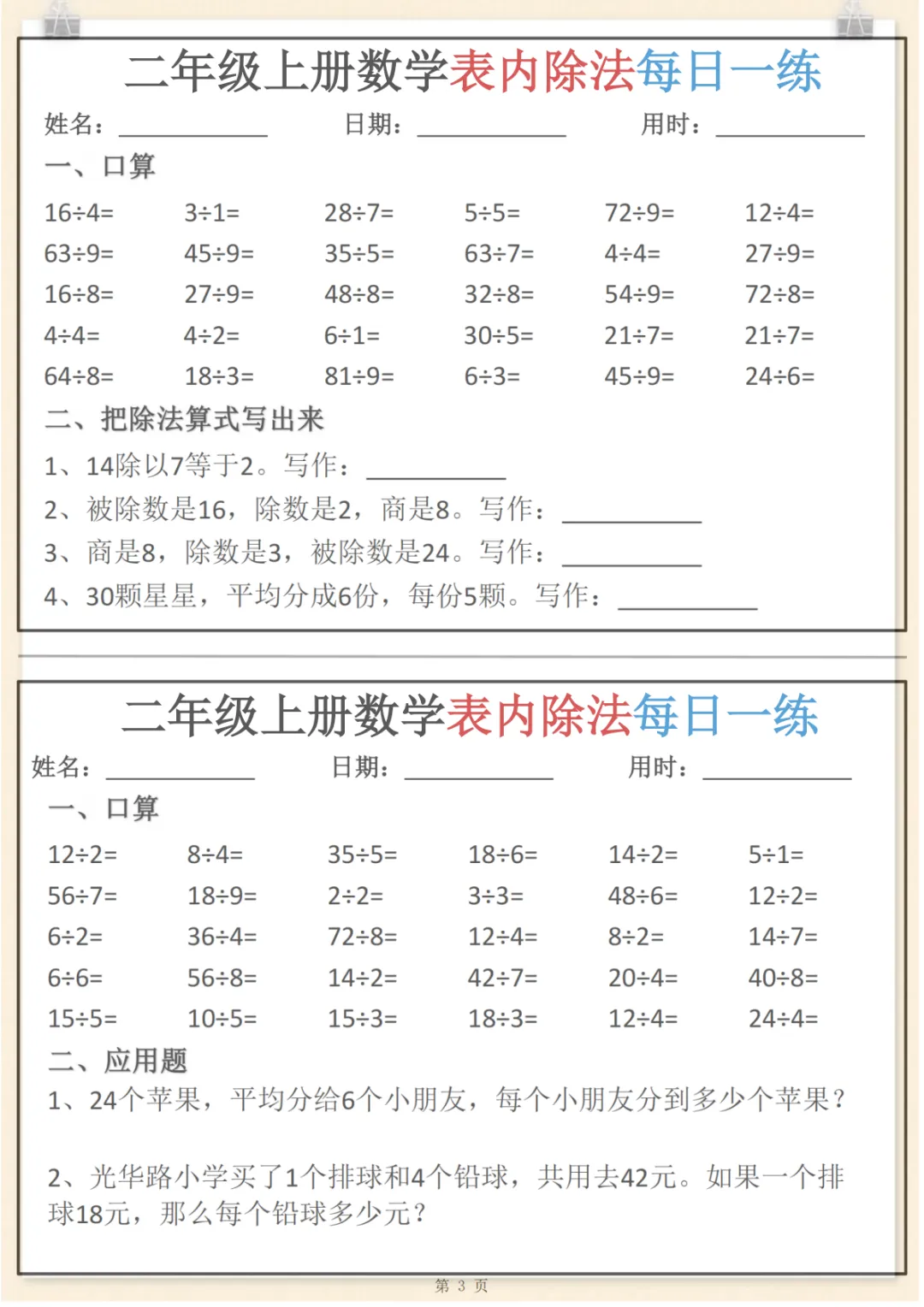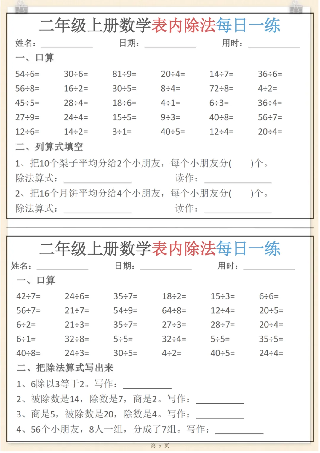 二年级上数学表内除法每日一练小纸条,共7页,电子版可下载可打印,这份资料围绕二年级数学表内除法练习设计,涵盖多个核心知识点与专项训练内容,适合孩子进行日常巩固、查漏补缺和同步提升,帮助孩子在反复练习中加深对除法基础的理解,提升计算熟练度与做题信心。需要的家长可以抓紧下载打印出来,让孩子每天练一练。