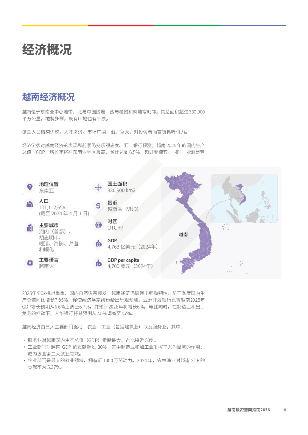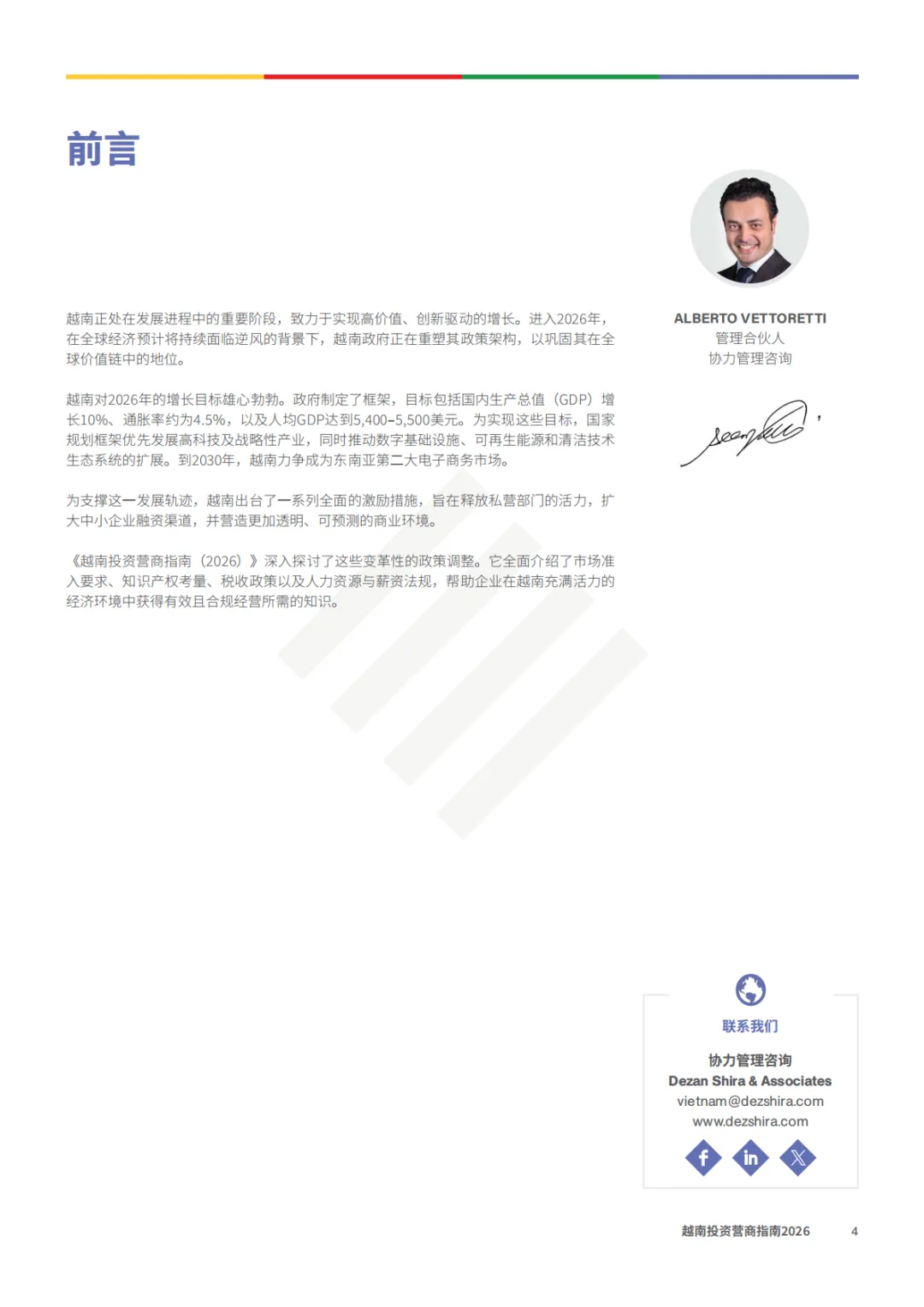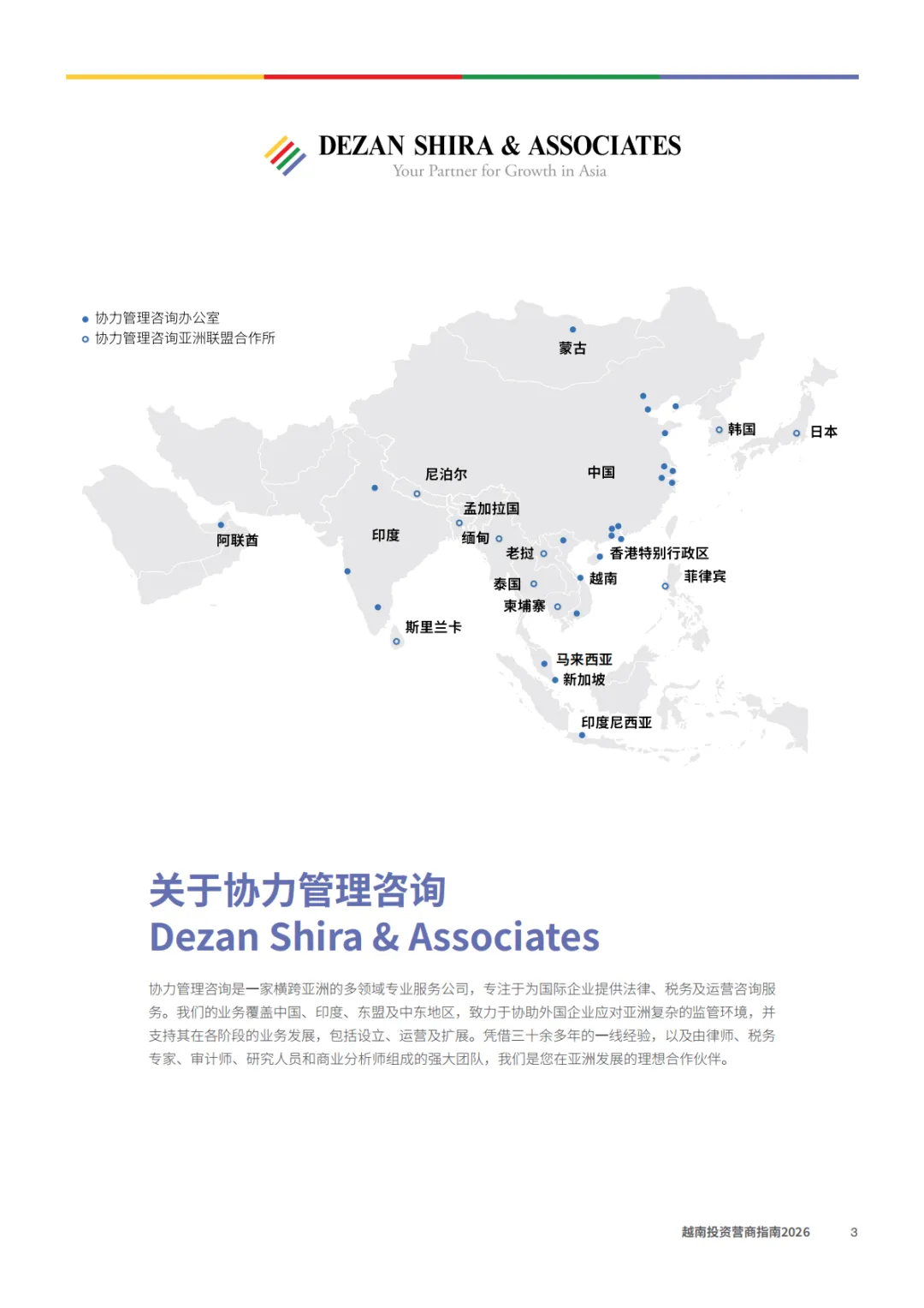 这份《越南投资营商指南2026》由协力管理咨询公司发布,全面介绍了越南在高附加值增长战略背景下的投资环境、政策更新与营商实务。以下是报告的核心内容概括: