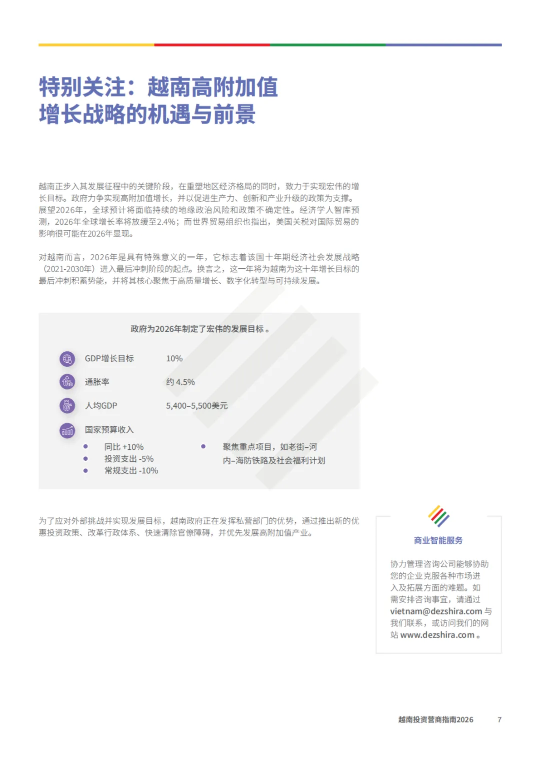 发展目标:2026年越南GDP增长目标为10%,通胀控制在4.5%左右,人均GDP目标为5,400-5,500美元。
