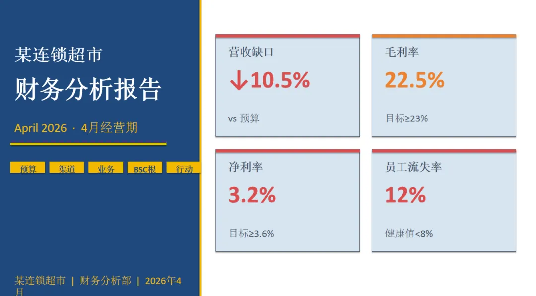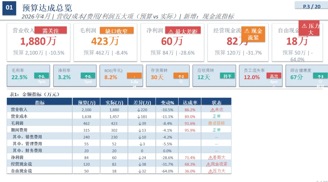 财务维度(滞后) :营收达成率86.2%、净利率3.2%、经营现金流68.3%