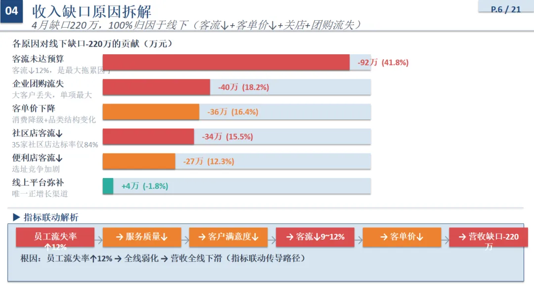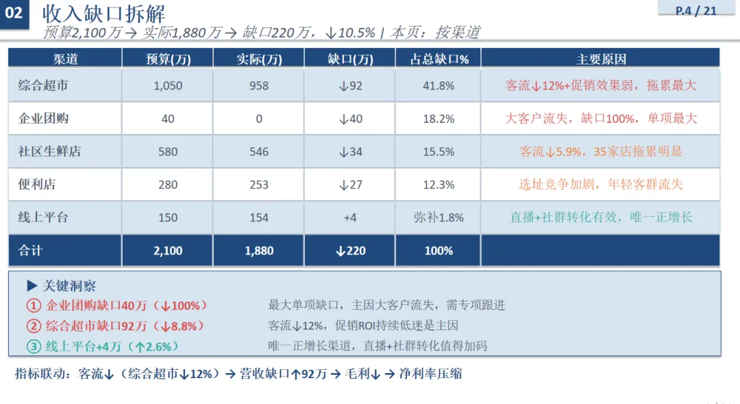 渠道维度 :综合超市缺口92万(客流↓12%)、企业团购缺口40万(流失100%)、线上平台+4万(唯一正增长)