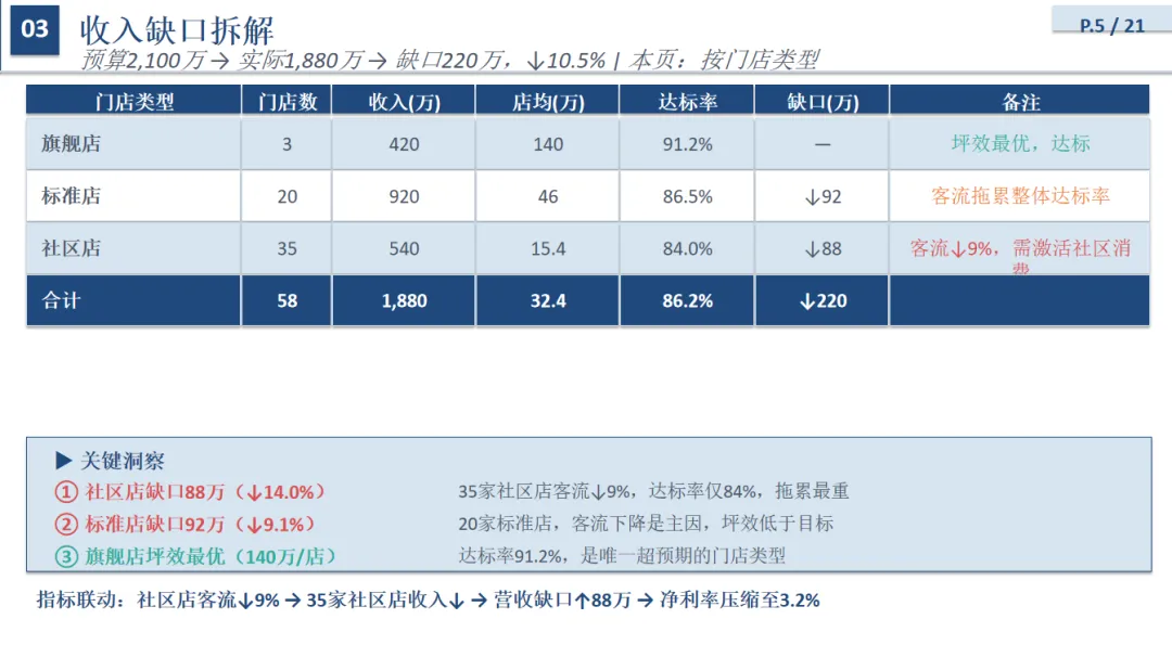 门店类型维度 :35家社区店达标率84%、缺口88万;20家标准店缺口92万;旗舰店达标率91.2%最优