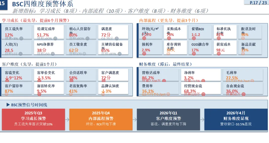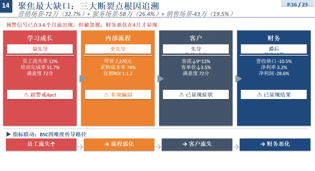 经BSC追溯, 员工流失率持续12%(学习成长维度) 是根本性前置信号,其恶化提前6个月即已出现