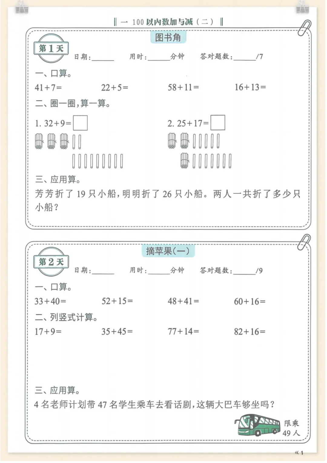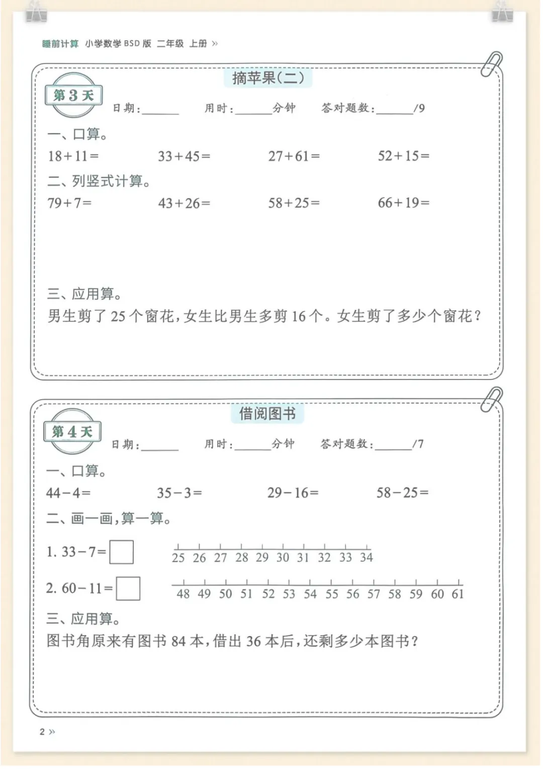 二年级(上)北师版数学睡前计算每日一练,共54页,电子版可下载可打印,这份资料围绕二年级上册数学学习内容设计,适合作为孩子日常巩固与睡前练习使用,涵盖多个核心知识点与专项训练内容,帮助孩子在持续练习中提升计算速度、准确率和解题熟练度,把课内基础打得更扎实。需要的家长可以及时下载打印出来,让孩子每天练一练,循序渐进养成稳定的计算习惯。