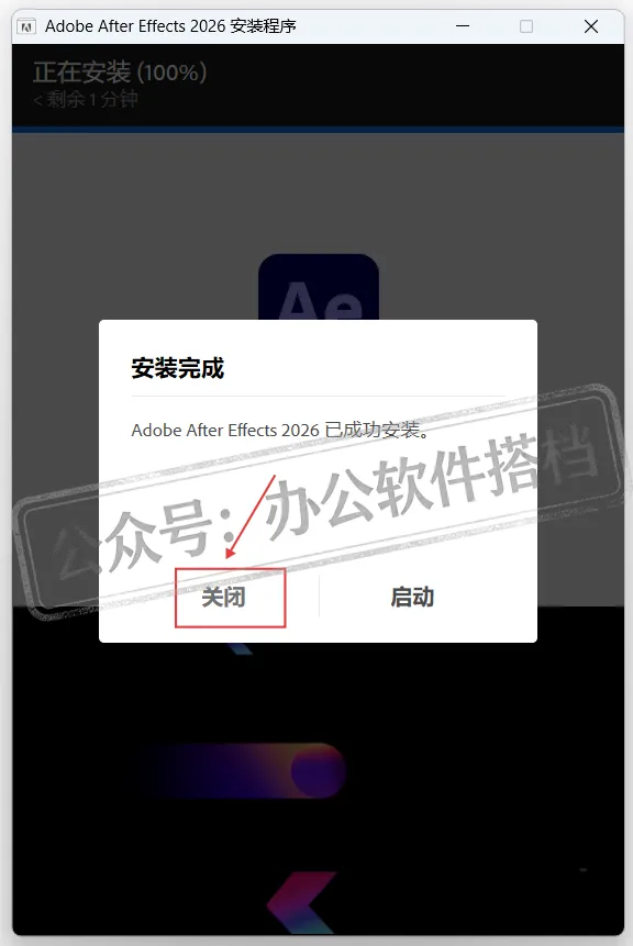 4.等到软件界面显示Adobe After Effects 2026安装完成,点击【关闭】。
