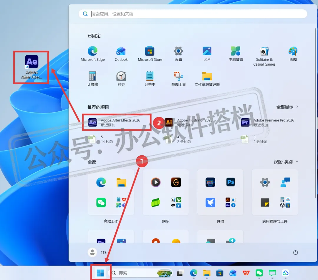 5.创建Adobe After Effects快捷打开图标:点桌面【开始图标】展开,找到刚安装的Adobe After Effects 2026程序,选中直接拖动到电脑桌面就可以创建完成。