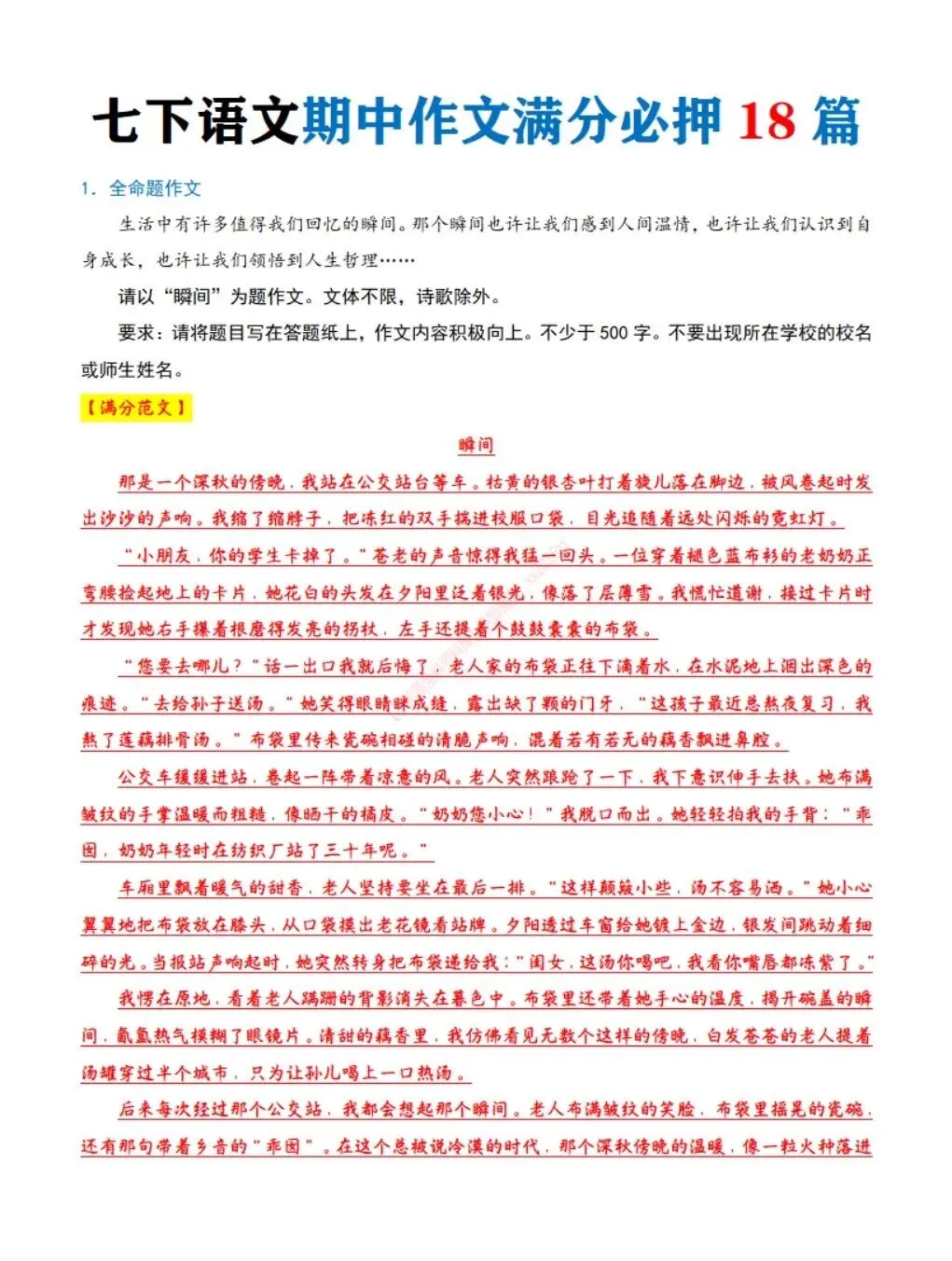 大家好,今天老师整理了:2026版七年级下册语文期中作文满分必押18篇,可打印电子版!