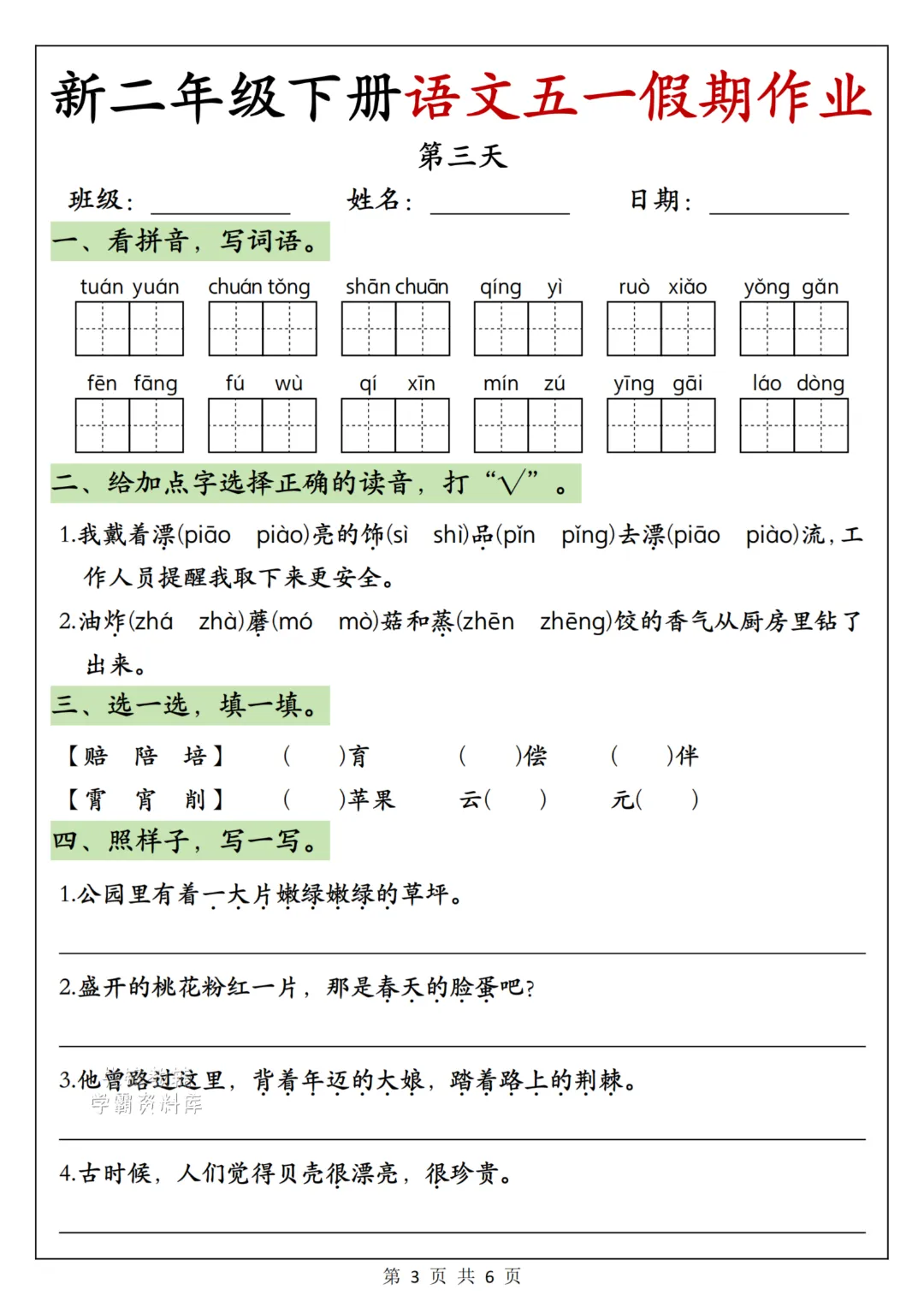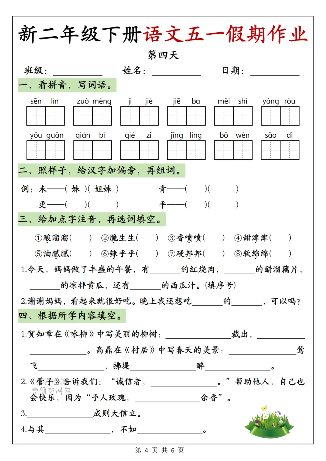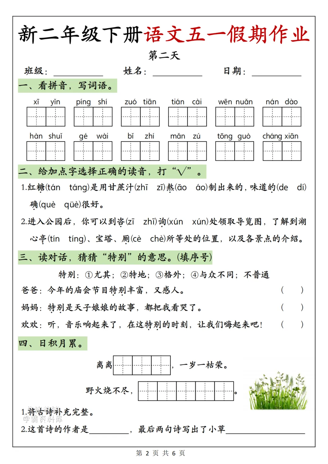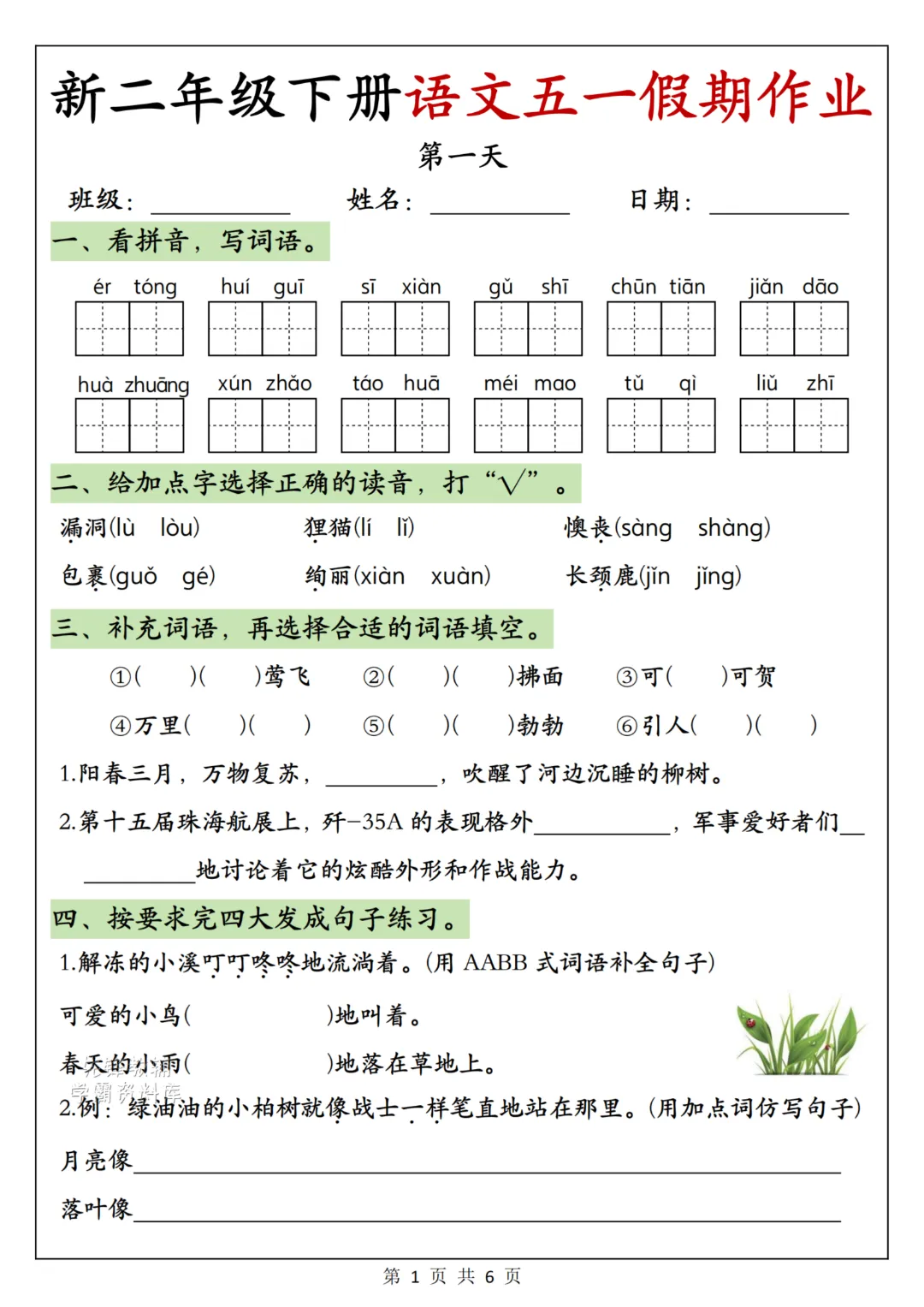 26年新二年级下册语文《五一假期作业》电子版可打印点击蓝字 关注 OURDREAM五一假期马上来啦,为了不浪费孩子的时间也不耽误学习,今日分享一份二年级五一《假期作业》,巩固一下之前所学。家长给孩子打印出来每天安排一点点!温馨提示:文末有电子版领取方式(因篇幅有限,仅展示内容)领取完整高清电子版:①:点一点右下角的“赞”和“在看” ②:在左下角点击:关zhu ③ : 在公众号对话框回复:260427查看更多文章说明本微信公众账号分享的资源均通过网络等公共合法渠道获得,仅供试用!版权属于原出版机构或影像公司,本资源为电子载体,传播分享仅限于家庭使用与交流心得、参考和辅助购买决策,不得以任何理由在商业行为中使用,若喜欢此资源,建议购买实体产品。文章中的视频及图片均来自网络,版权归原作者或原出版社所有。如有侵权,请及时联系删除。