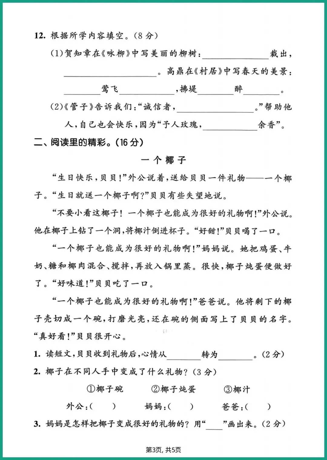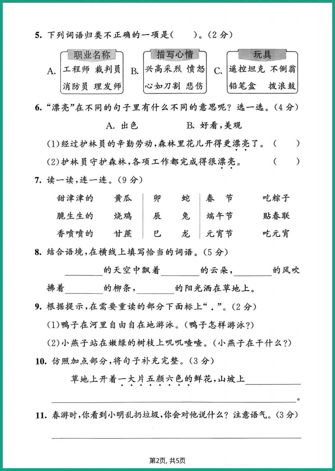 2026春统编版二年级下册语文期中质量检测卷,新鲜出炉5页电子版,一键就能打!这套卷紧扣课本1-4单元,拼音、字词、句子、阅读、写话全囊括,题型活像“真题小雷达”,帮孩子快速扫描薄弱点,期中不慌。基础巩固能力拔高双管齐下,做完提分看得见!家长朋友们,别等孩子临考才抱佛脚,现在就把卷子打印出来,每天一页,轻松领跑半个学期!