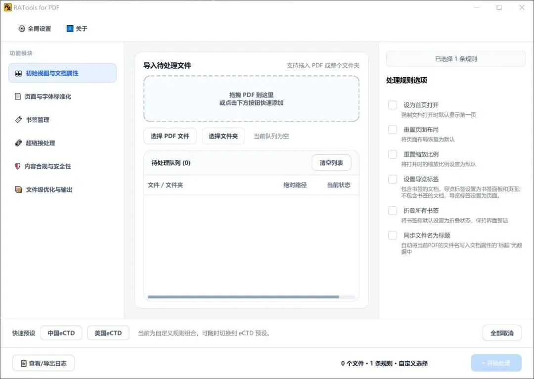 按需勾选与快捷预设:在界面上,你可以根据本次递交的具体要求,自由勾选需要执行的处理项(如统一蓝字链接、转换为A4、清理元数据等)。同时,工具目前已内置了中国eCTD和美国eCTD两套快速预设,一键即可载入符合法规要求的标准配置(后续也会根据需要持续添加更多预设)。