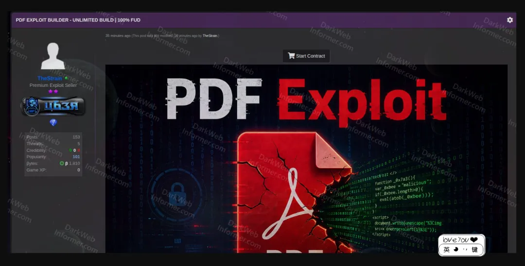 一名威胁行为者正在一个知名网络犯罪论坛上出售一款号称100% FUD(完全免杀)、支持无限次构建的PDF漏洞利用构建工具,其分级许可证起售价为300美元。
