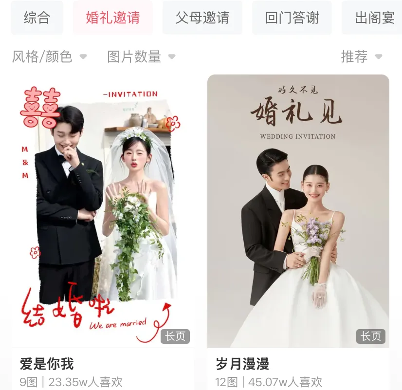 应该都收到过亲戚朋友结婚发的请柬吧,有纸质的也有电子的,现在电子的居多,要结婚了往朋友圈里一发基本上刷到的都知道了,个别关系好的单独发一发。这种请柬在微信小程序上或者某些请柬模板软件上一般就收你个几块钱或者开通个会员就能随意使用,你对着模板填好信息即可。国内还是卖的很便宜的,以中国人的消费观念是不愿意多花钱在这种虚拟的电子模板上的。