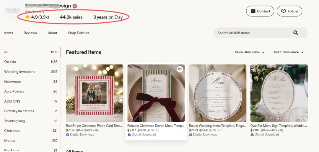 但是我今天在一个海外平台上看到一个卖家,卖的也是电子请柬模板,居然轻轻松松就做到了年均15000+的销量,三年总共卖了44.5k单,并且一个单价平均的单价在7~13美金,折合人民币大约在48~89区间!