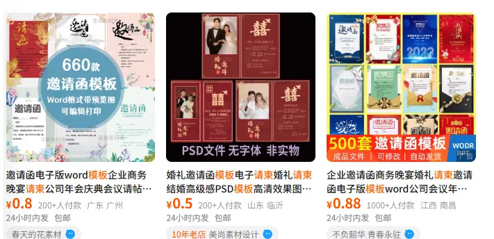 当然你不能拿国内的这种请柬模板直接照搬到国外电商平台去卖,这种设计只符合中国人的审美,但从这可以看出确实是成本不高,随便搞来几个模板就能在国内拿来卖,都可以批发了!