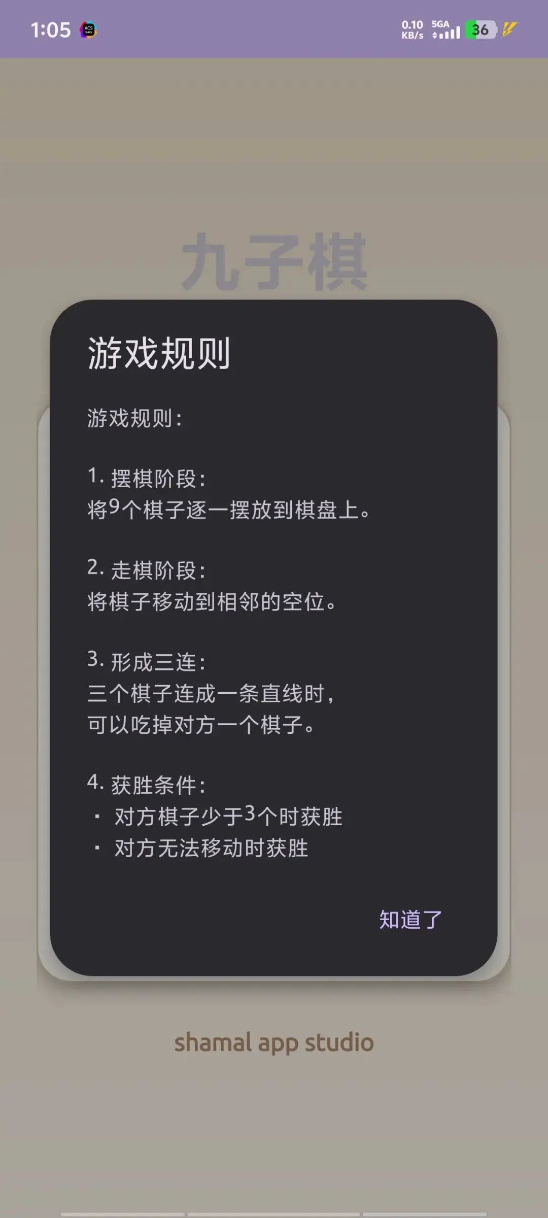 九子棋,顾名思义,双方各有9颗棋子。通过“摆棋-走棋-吃子”,三个棋子连成一线(形成“三连”)就可以吃掉对方一颗棋子,直到一方棋子少于3颗或无法移动为负。