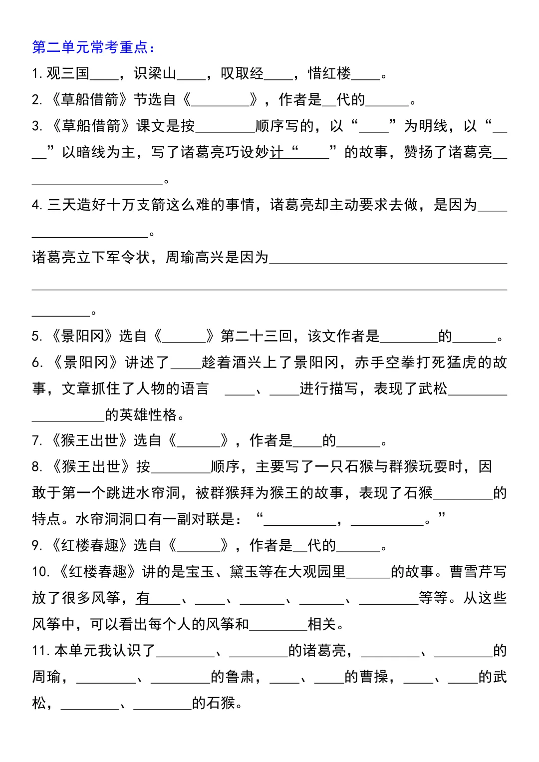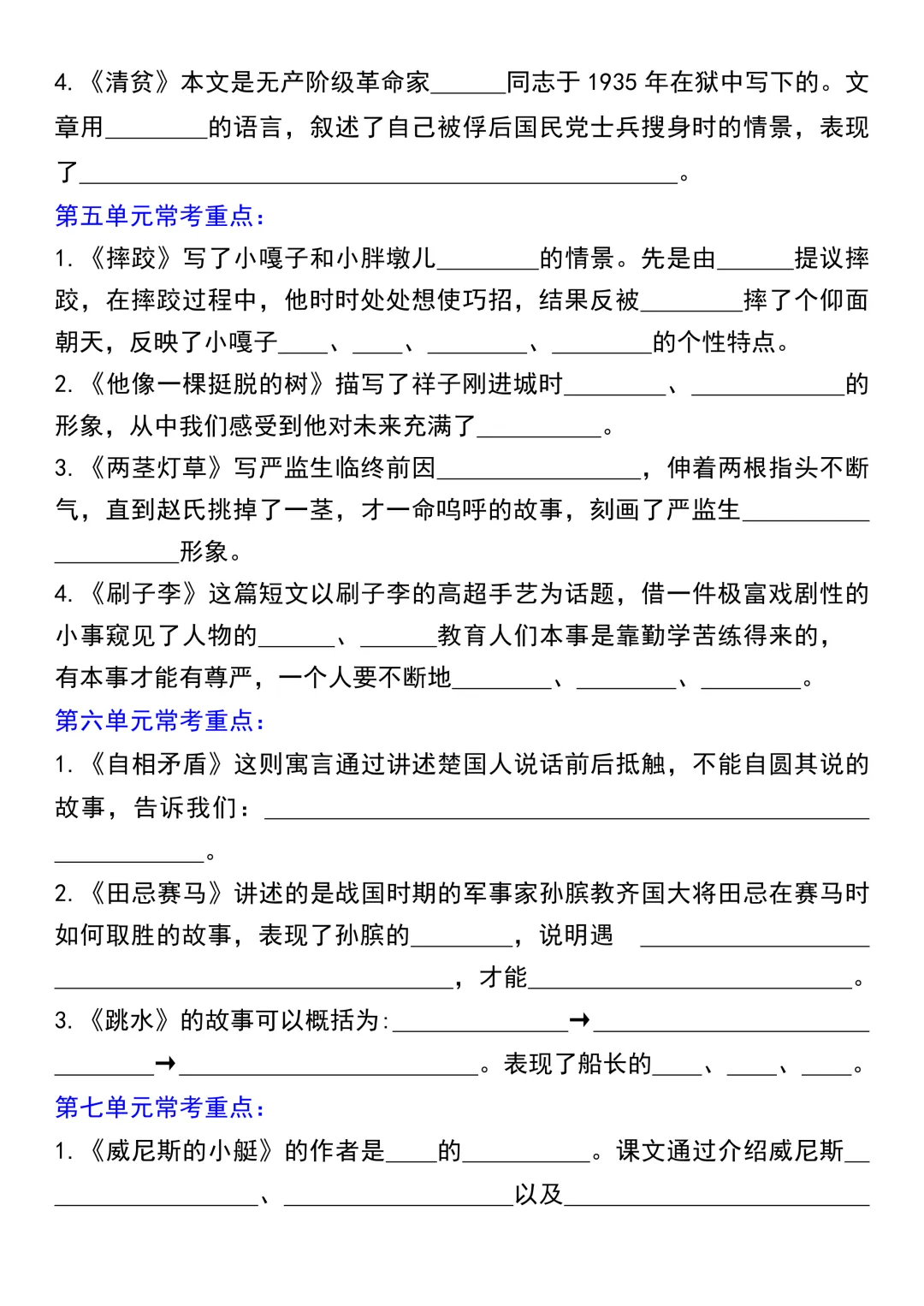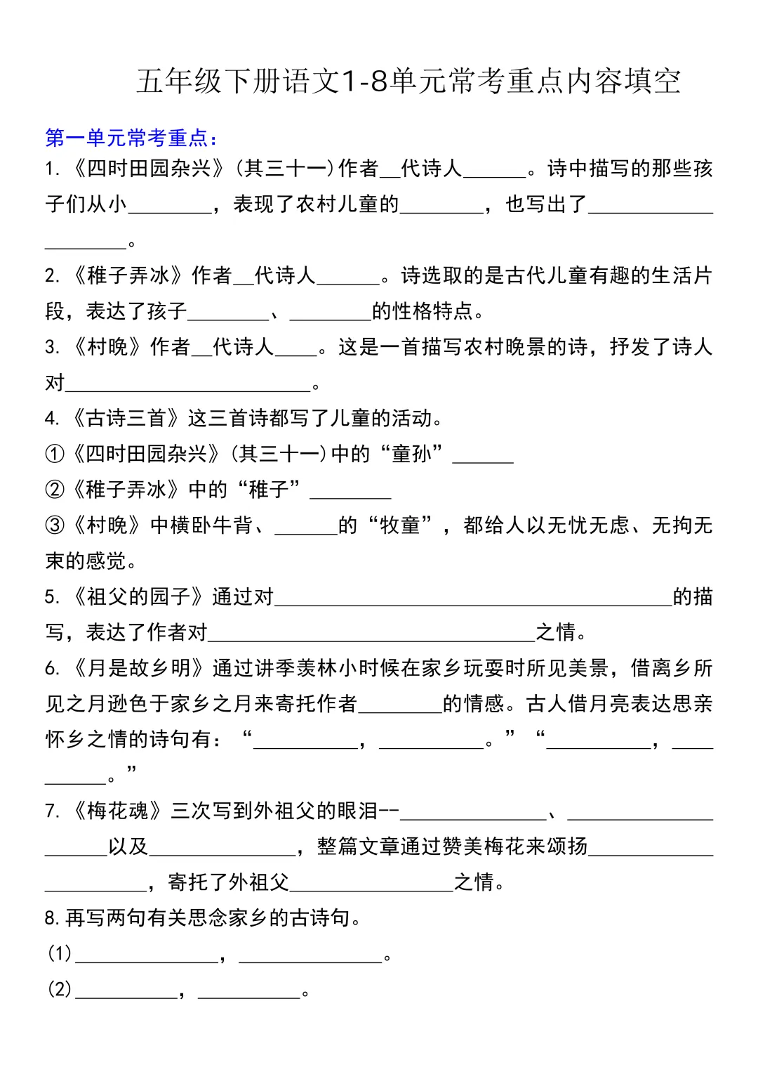 今天为大家分享:期末复习最怕知识点零散、抓不住重点。五年级下册语文 1-8 单元常考重点汇总,把每一课的核心考点都整理成了填空式清单,从四大名著到爱国主题,从寓言故事到写景散文,全覆盖无遗漏,考前过一遍,基础分稳稳拿下。