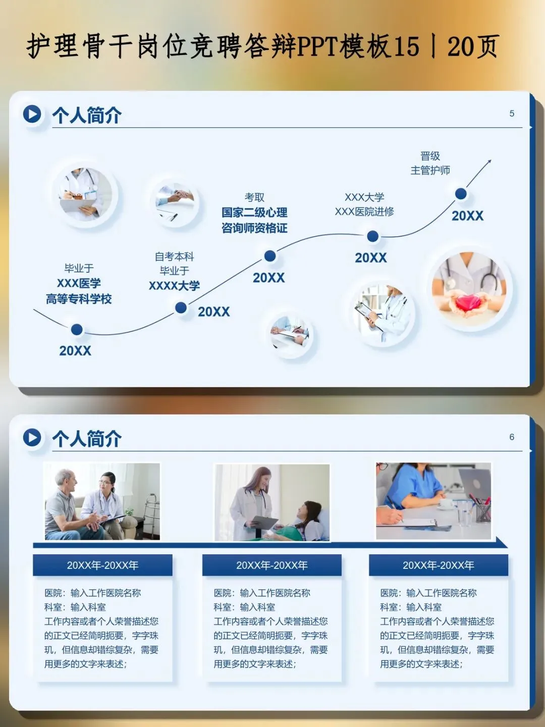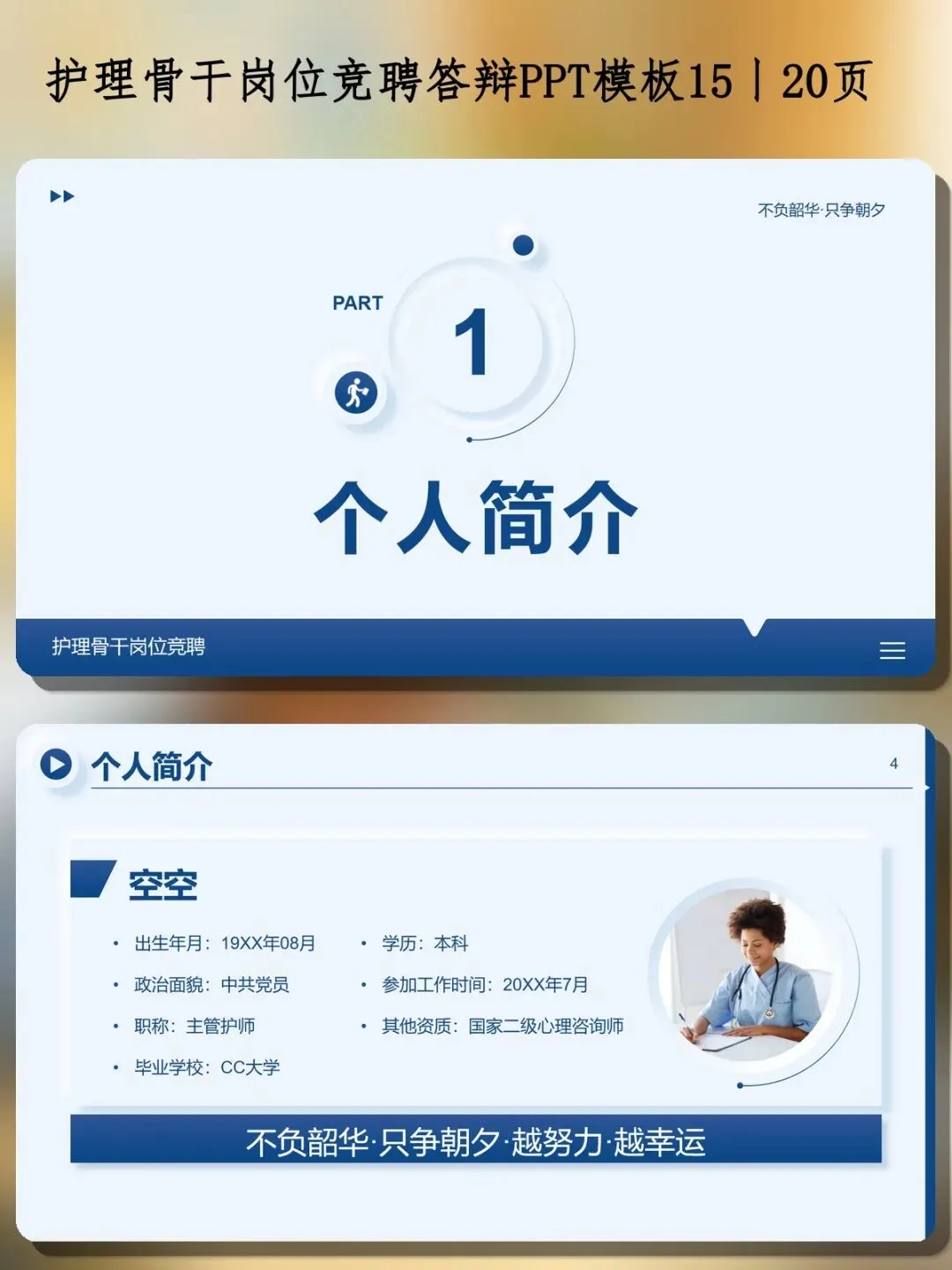 这一部分要快速建立信任感。模板包含了:出生年月、政治面貌、职称、毕业院校、学历、参加工作时间、其他资质(如国家二级心理咨询师)。还设计了时间轴式的成长轨迹——从毕业到自考本科、考取资格证、外出进修、晋级主管护师,一目了然。