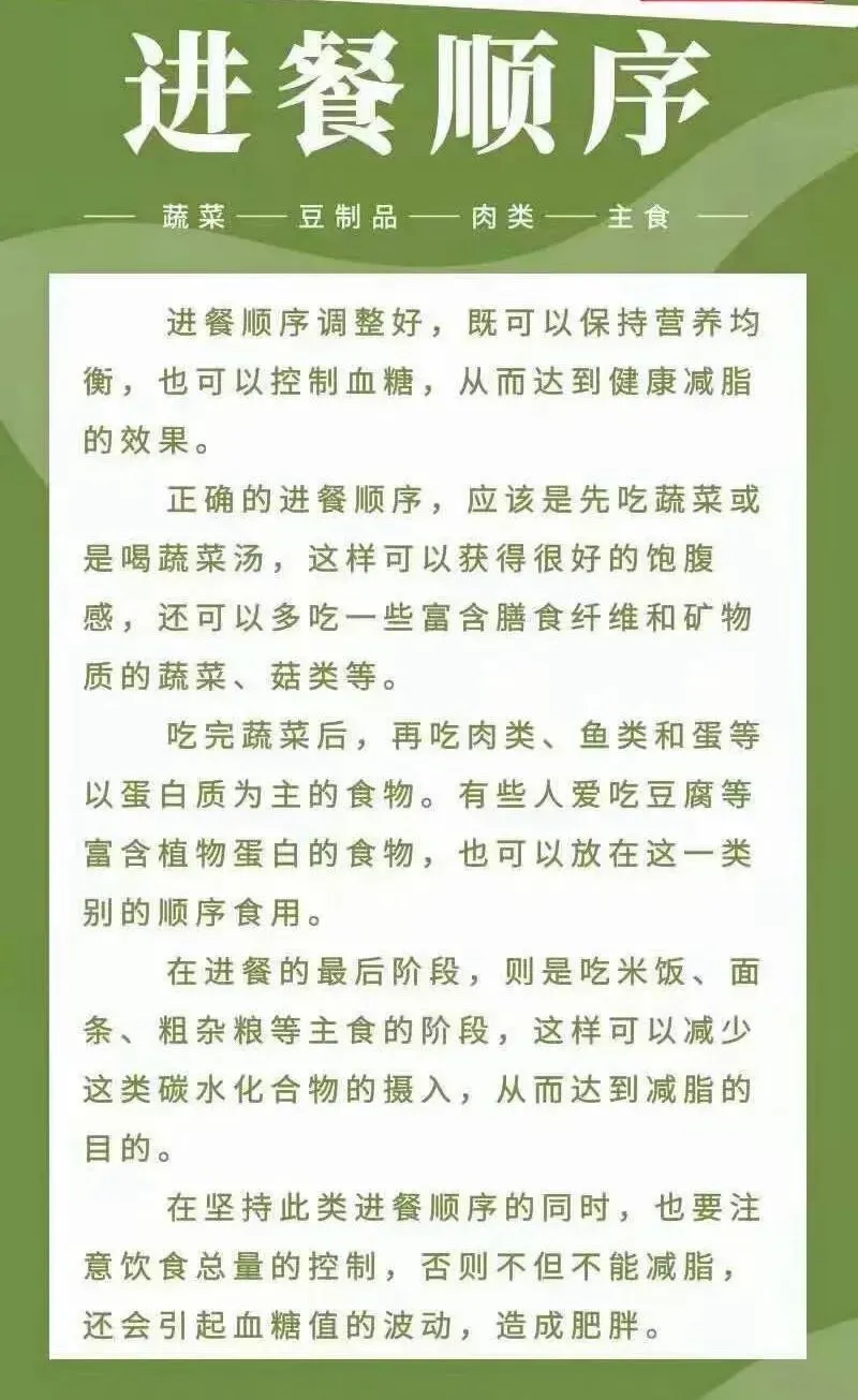 进食顺序:先吃蔬菜→再吃蛋白→最后少量主食
