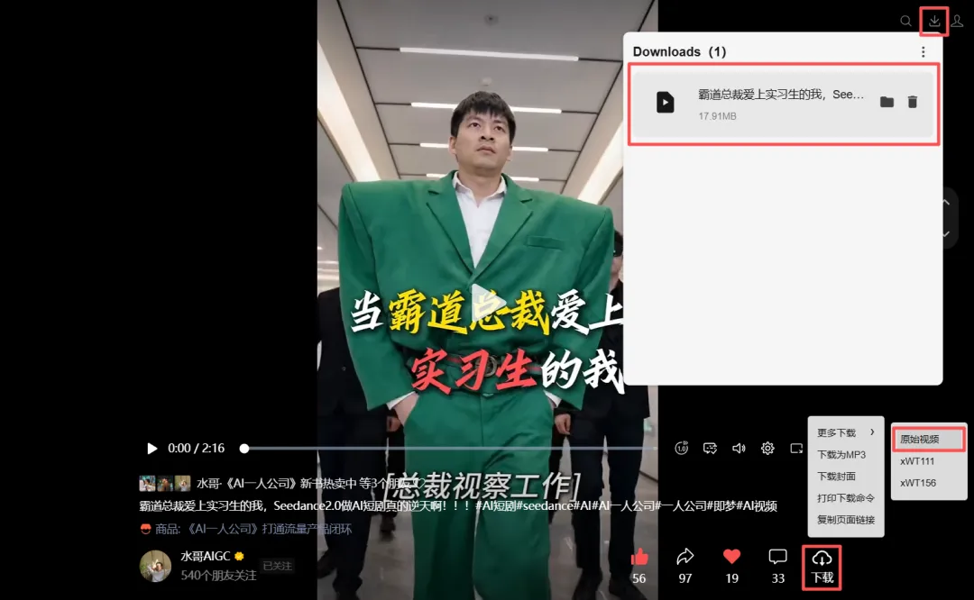 比如我打开我自己视频号里面的一个视频,是一个用AI做的短剧短视频。