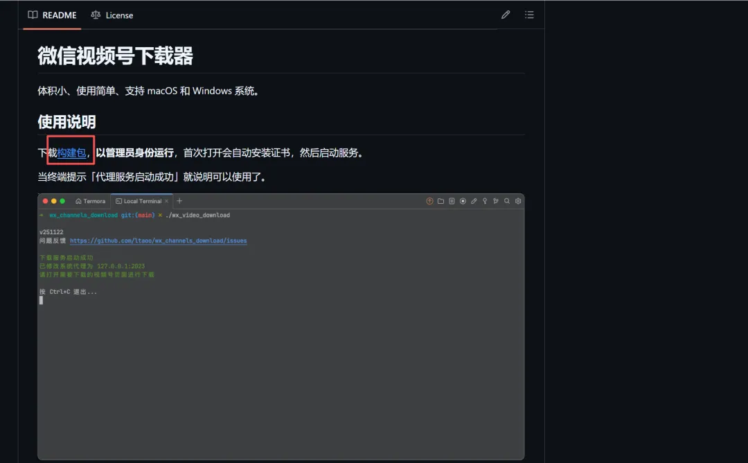 页面往下滑可以看到一个使用说明,有一个下载构建包的蓝色按钮,点击一下就能跳转到下载安装包的界面。