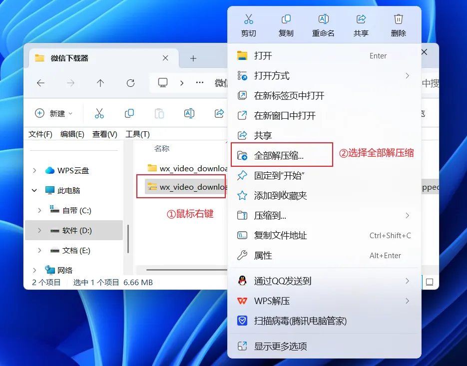 选中下载好的压缩包,直接鼠标右键单击一下,再选择全部解压缩,压缩一下。