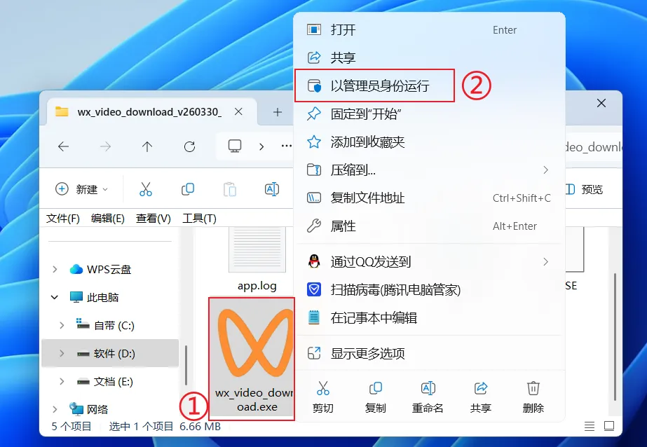 接着进入解压好的文件夹内,找到带有exe后缀的视频号图标,鼠标右键单击一下,选择以管理员身份运行。
