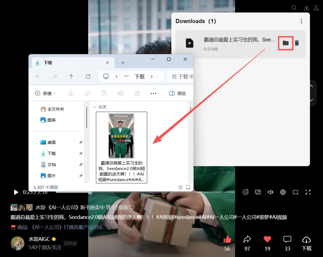 而且右上角的下载列表里面也会展示出来,可以直接点击文件夹的图标,就能直达视频下载的具体位置。