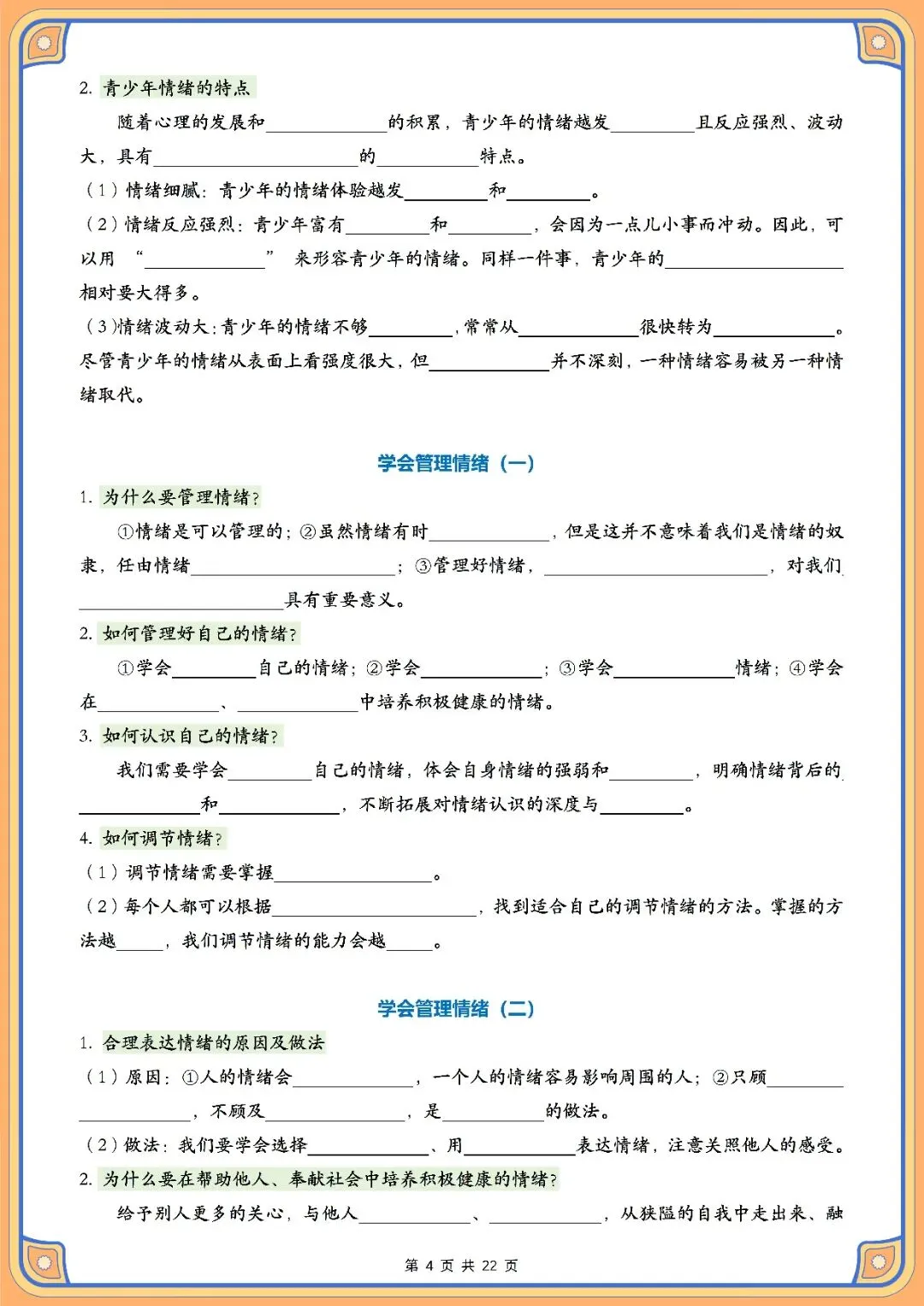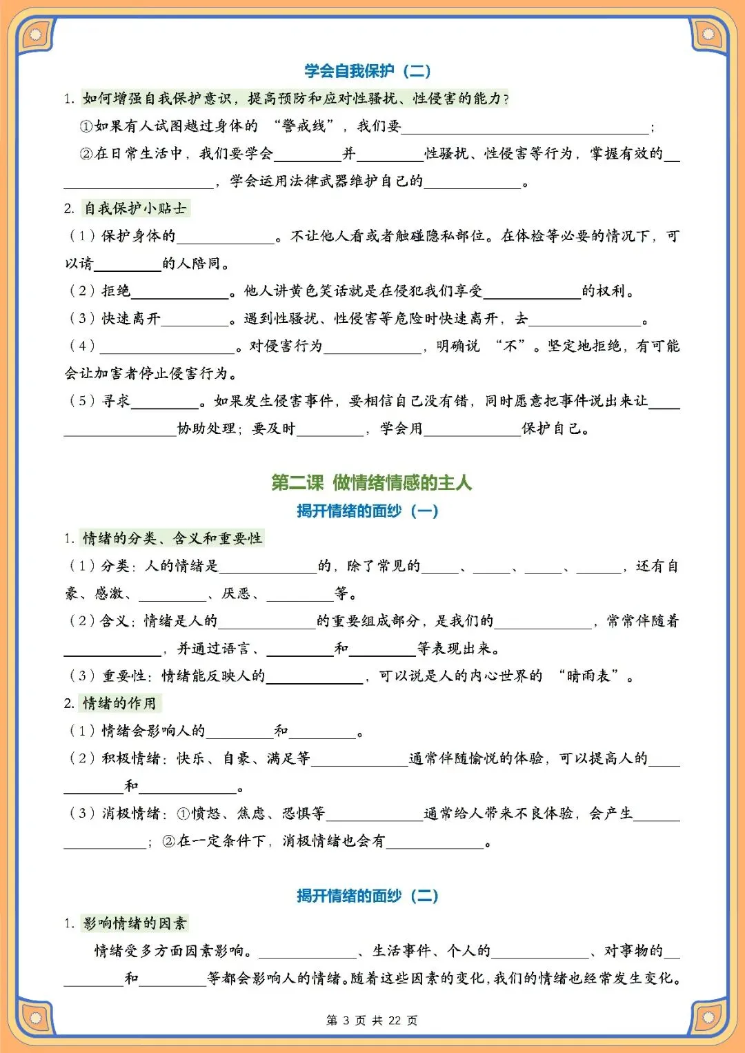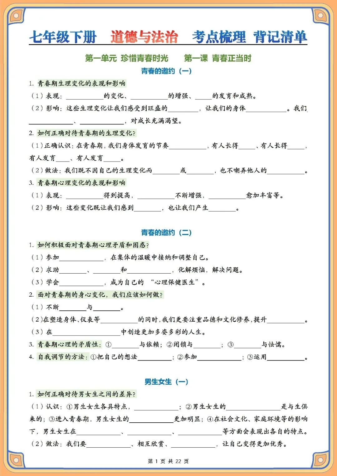 资料体系以青春成长、情绪管理、自尊自信培养、中华优秀传统文化和法治安全这五个主题为主线,一共开设了十一节课的内容。其结构化的框架把青春期心理健康发展的关键要点,情绪调节的策略、自我价值的建立,传统文化的精华以及法律知识教育结合在一起,用简洁易懂的方式来表述核心的内容,让学习者直接抓住重点,实现高效复习并准确找到考试得分点。配套空白默写练习册用填空题的形式来组织,意在引导学生完成背诵之后立即进行实践操作,通过即时反馈和反复练习使知识得到有效的内化,妥善处理因概念不清或者容易出错的词汇造成的记忆问题。本资料适合课后自主复习、单元总结测试、期中、期末等阶段性考核使用,只需要每天花费10-15分钟就可以对七年级下册道德与法治科目核心知识点有系统性的了解。