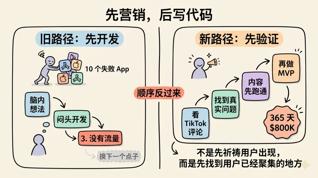 很多开发者的问题不是不会做产品,而是太容易从“我想做什么”出发。Glow Up 让我明白,成功的顺序应该反过来:先看用户已经在讨论什么,先验证内容能不能跑通,再用最小版本承接流量。