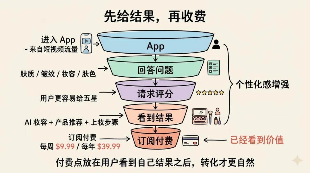 对我们来说,核心假设不是“能不能做一个漂亮 App”,而是“用户看到 AI 试妆结果后,会不会下载、使用、付费”。
