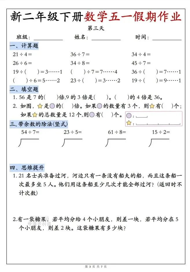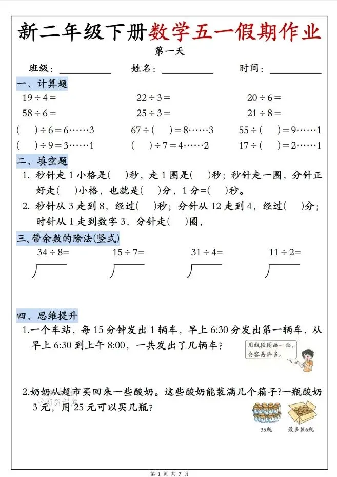 今天给大家整理了26春二年级下册数学五一假期作业,转发给朋友或班级群,受益更多人,帮助孩子学习!