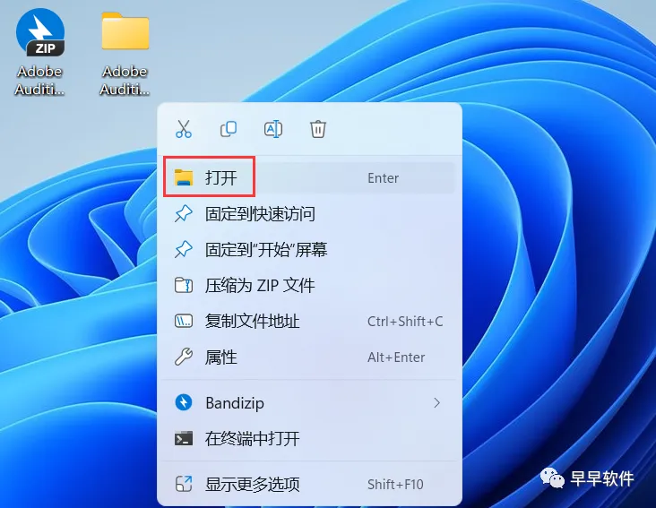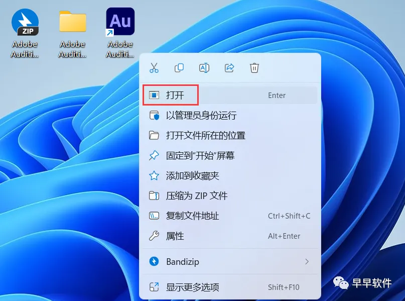 7、回到桌面,右键桌面上的【Adobe Audition 2023软件图标】,点击【打开】