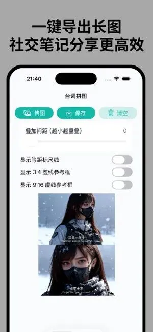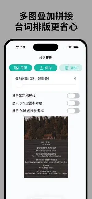 ![]() 一款专注多图拼接排版应用。支持多图拼接叠加,可自由调节图层间距、自定义拼接分隔线,提供常用比例参考框,高清导出后可一键保存至相册。可满足台词截图拼接、社媒配图制作、长图排版等需求,操作易上手,以本地处理为主,出图稳定高效。