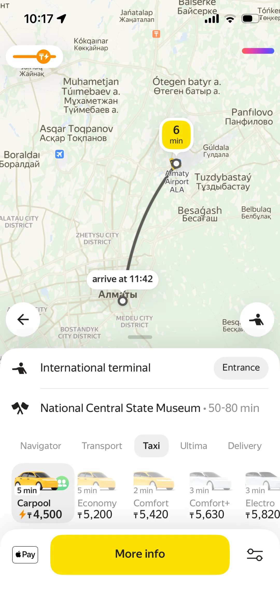 今天我抱着试试看先下载,注册不了也没关系,结果2分钟就注册成功了,有点不可思议。我先到Apple Store里去搜Yandex Go App,然后点击下载,下载完以后按常规填入email地址,设置密码,然后到邮箱里去确认邮址,确认之后按步骤填国内手机号码,然后收到验证码,把验证码输入进去以后就注册成功了。语言也不用选,界面是英文,付款方式也不需要设置,直接看到付款方式有Apple Pay 、Cash和添加银行卡,我就选Apple Pay打勾,就完成了所有操作。然后就看到了跟我们在滴滴软件上看到的一模一样,只是英文界面,只要选择出发地点和到达地点,下面就显示了各种车辆的不同价格,看来一切都已准备就绪,到阿拉木图机场一落地立马就可以用了。
