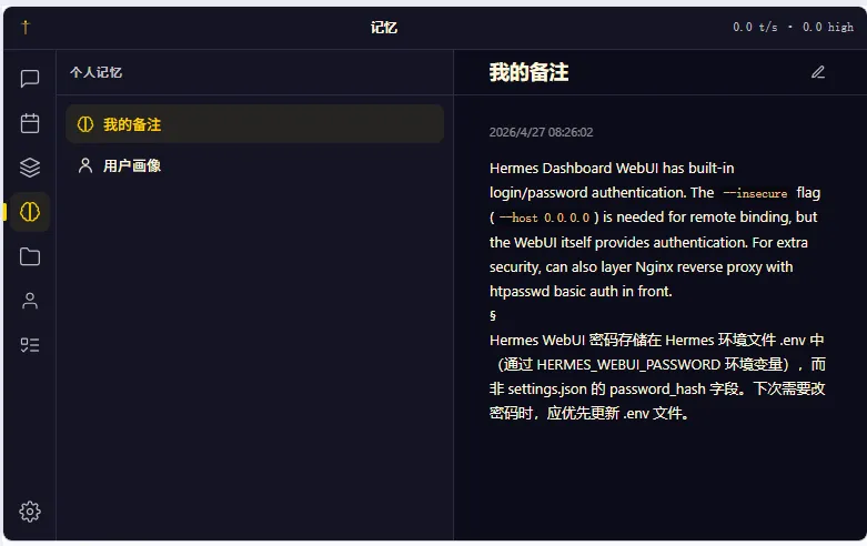 1 2 3 4 5 6 hermes gateway restart# 先停掉之前的进程sudo fuser -k 8787/tcp# 重新启动(密码已写入 .env)cd ~/hermes-webui./start.sh